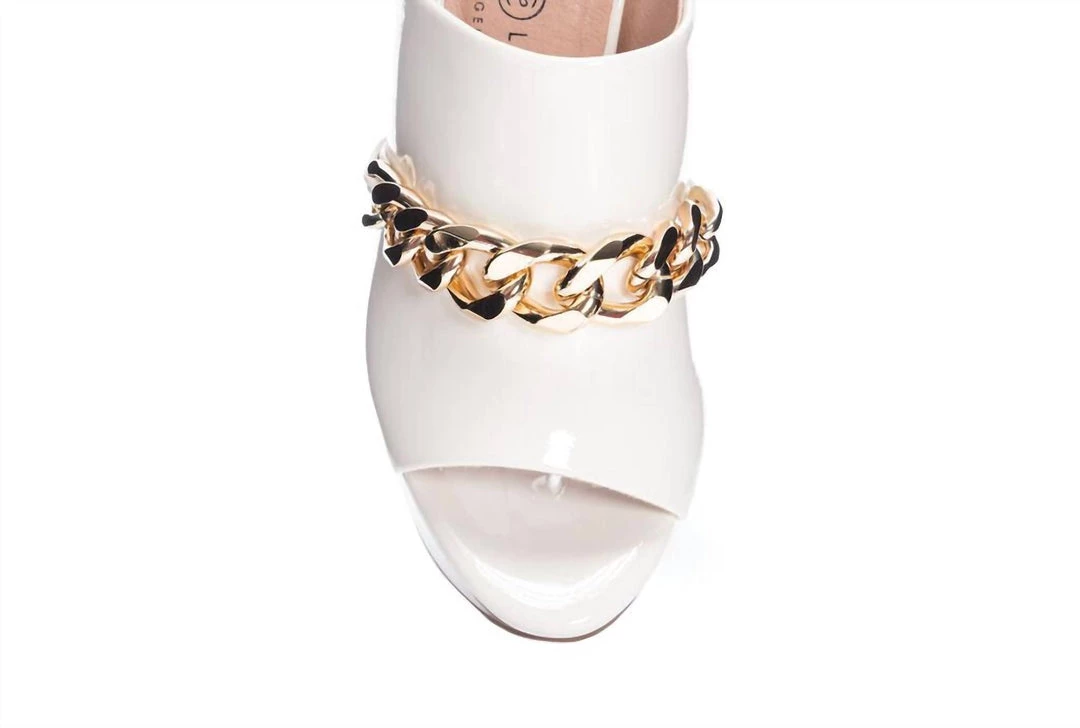 Be retro and chic in this stylish sandal with a high gloss, chain link, high platform and block heelMaterials – Synthetic upper, lining and soleHeel Height – 4.5″ with a Platform of 1.5″
